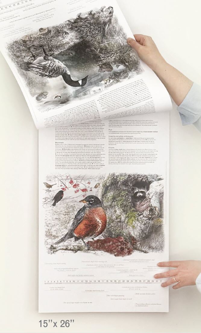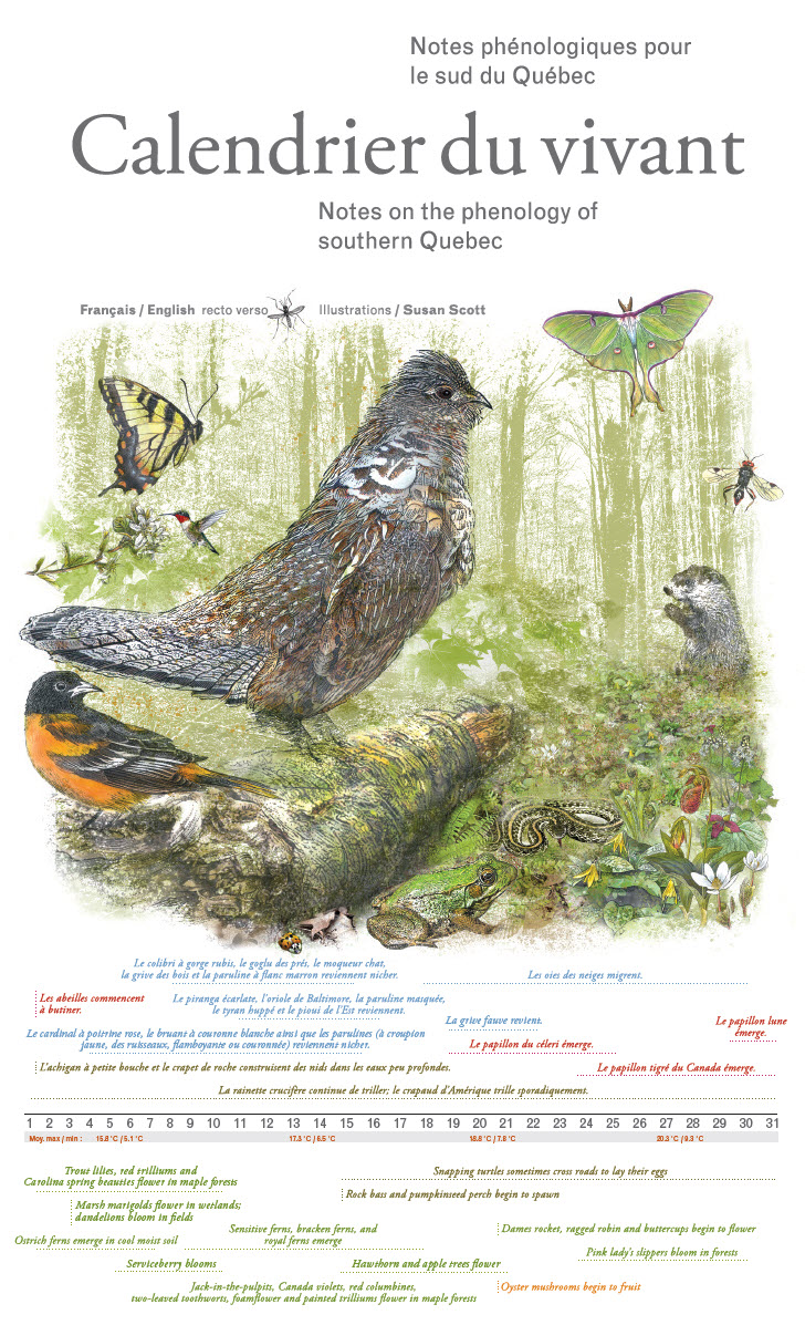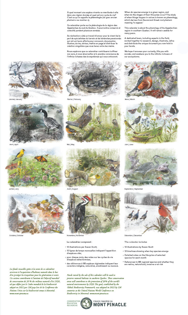 Ce calendrier permet de suivre les rythmes saisonniers de plus de 300 espèces de plantes indigènes, d’insectes, d’oiseaux et de mammifères de notre région des Appalaches du Sud du Québec. Il pourra être conservé et consulté pendant plusieurs années. Sa réalisation a été un travail d’amour pour le vivant de la part de plus de 40 spécialistes du terrain et de bénévoles passionnés qui ont uni leurs efforts, galvanisés par les extraordinaires illustrations de Susan Scott.
