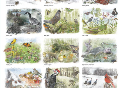 Ce calendrier permet de suivre les rythmes saisonniers de plus de 300 espèces de plantes indigènes, d’insectes, d’oiseaux et de mammifères de notre région des Appalaches du Sud du Québec. Il pourra être conservé et consulté pendant plusieurs années. Sa réalisation a été un travail d’amour pour le vivant de la part de plus de 40 spécialistes du terrain et de bénévoles passionnés qui ont uni leurs efforts, galvanisés par les extraordinaires illustrations de Susan Scott.